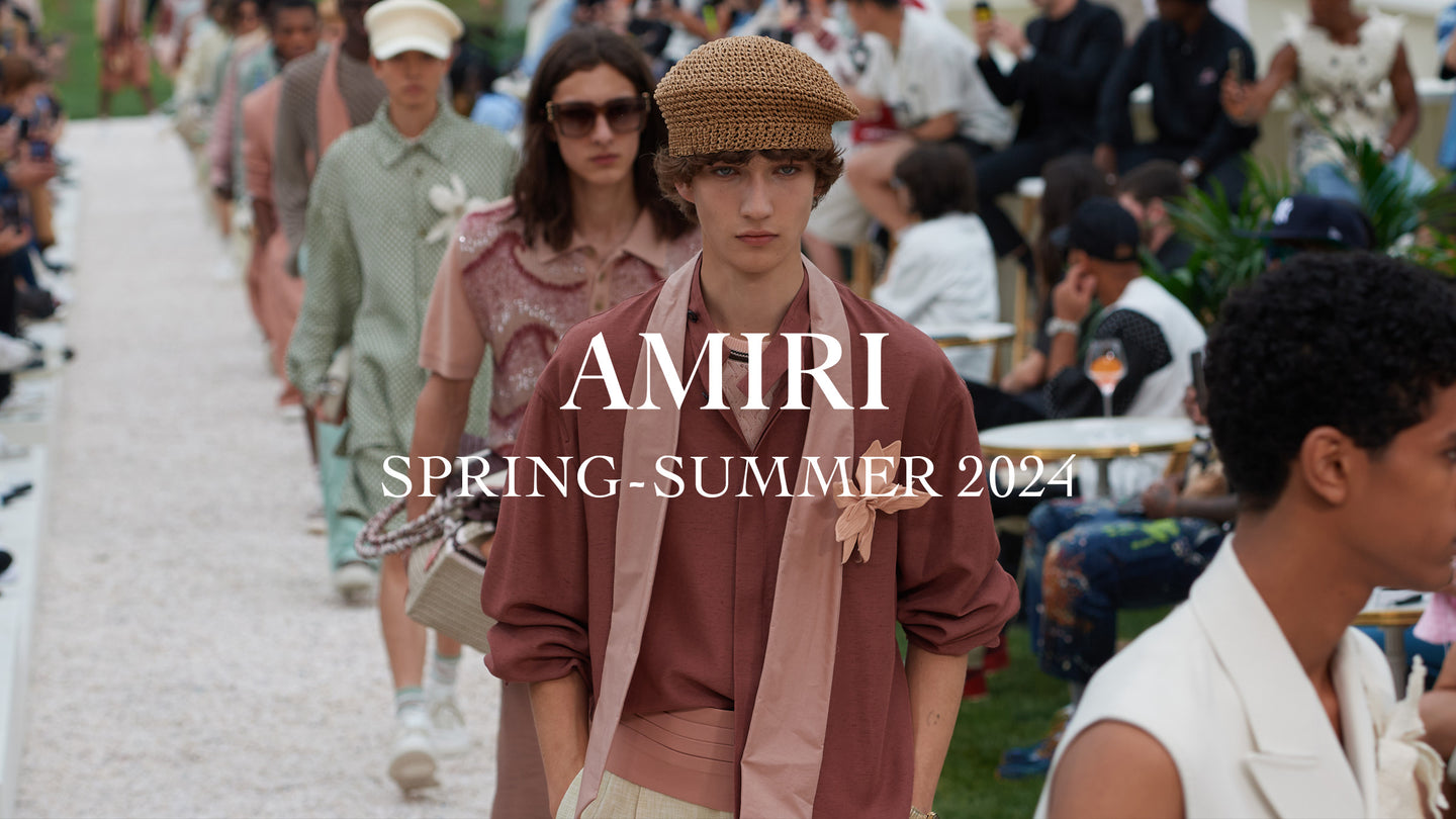 Spring-Summer 2024 captures AMIRI’s signature duality – a journey between Los Angeles and the South of France. Romantic yet grounded, the collection builds an aspirational wardrobe from found fabrics and instinctive artistry, bridging West Coast nonchalance with European refinement.
