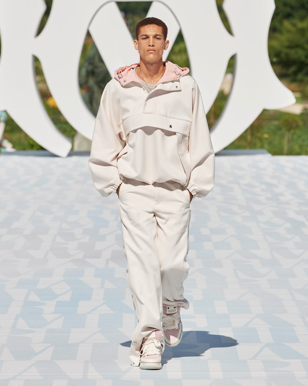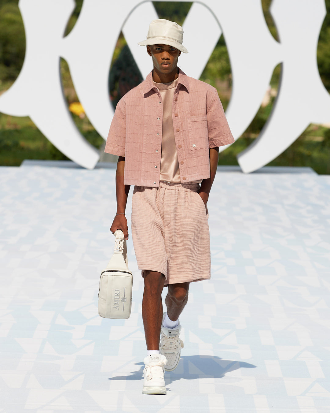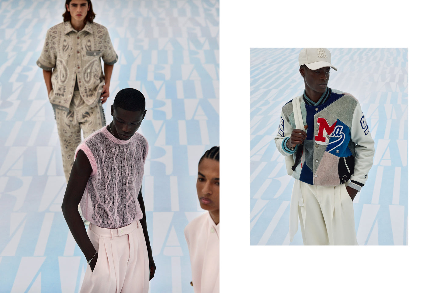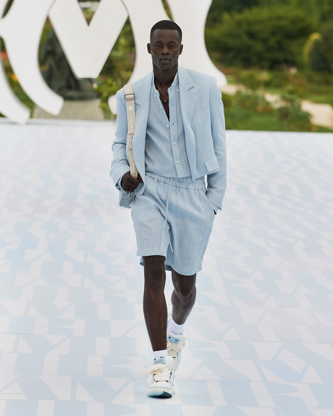 Spring-Summer ‘23 transposes Mike Amiri’s formative Los Angeles years onto a Parisian stage. Here, fleeting memories of skate parks, sports fields and early creativity are transformed into refined tailoring and expressive silhouettes. This is a world where suiting flows like jersey and stagewear meets skate style — blending sophistication with nostalgia in sun-faded hues of alabaster, dusty rose and azure blue.