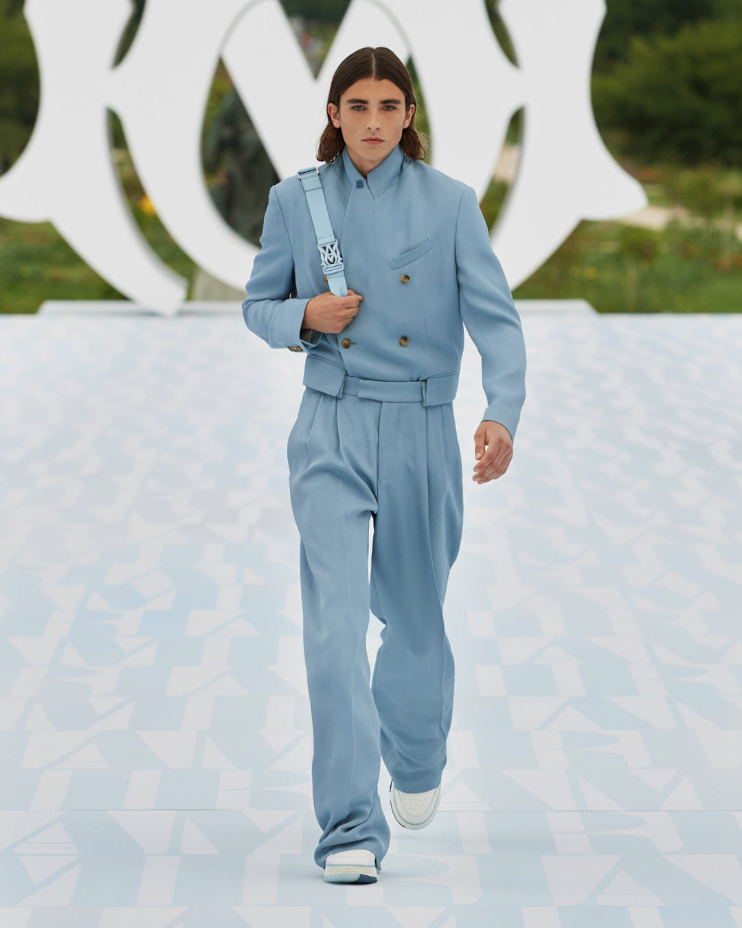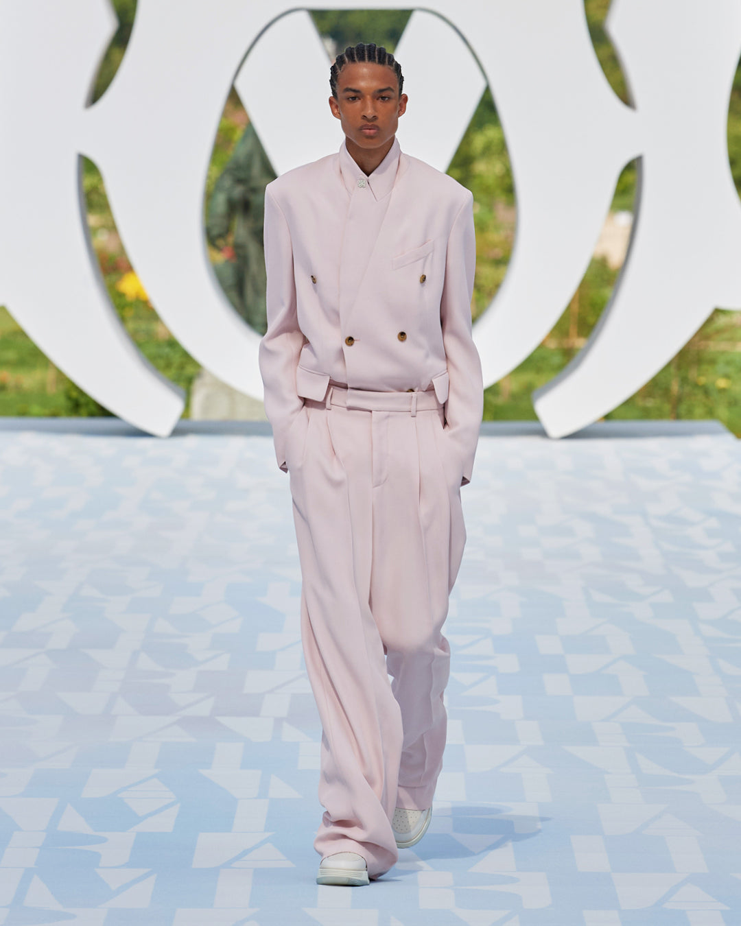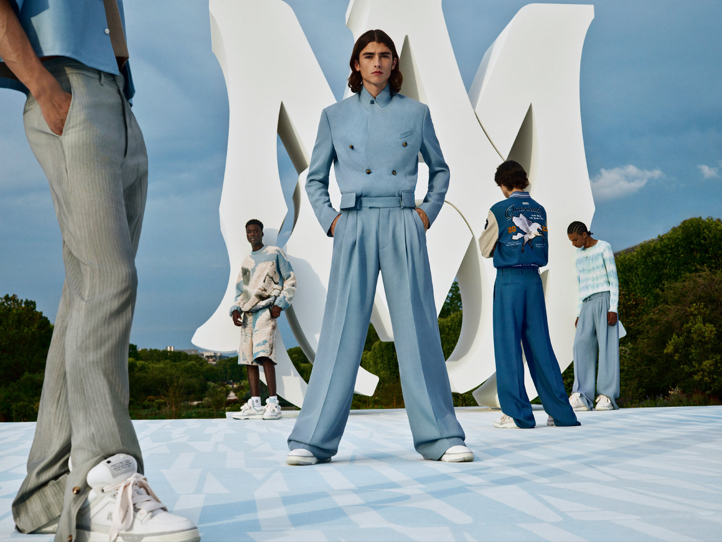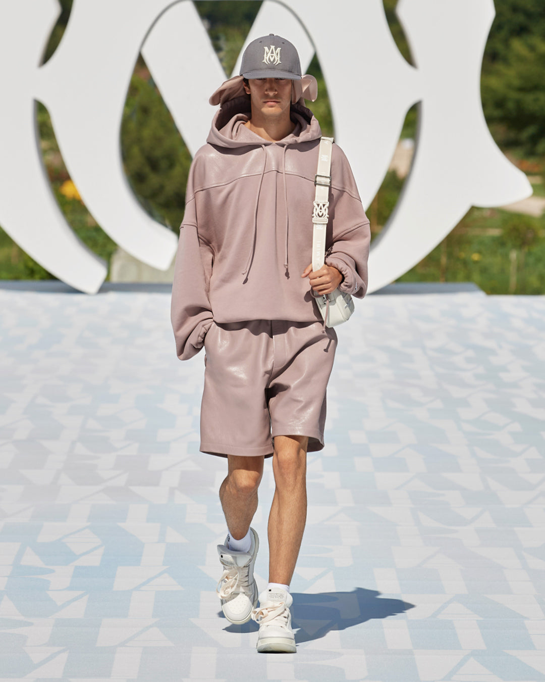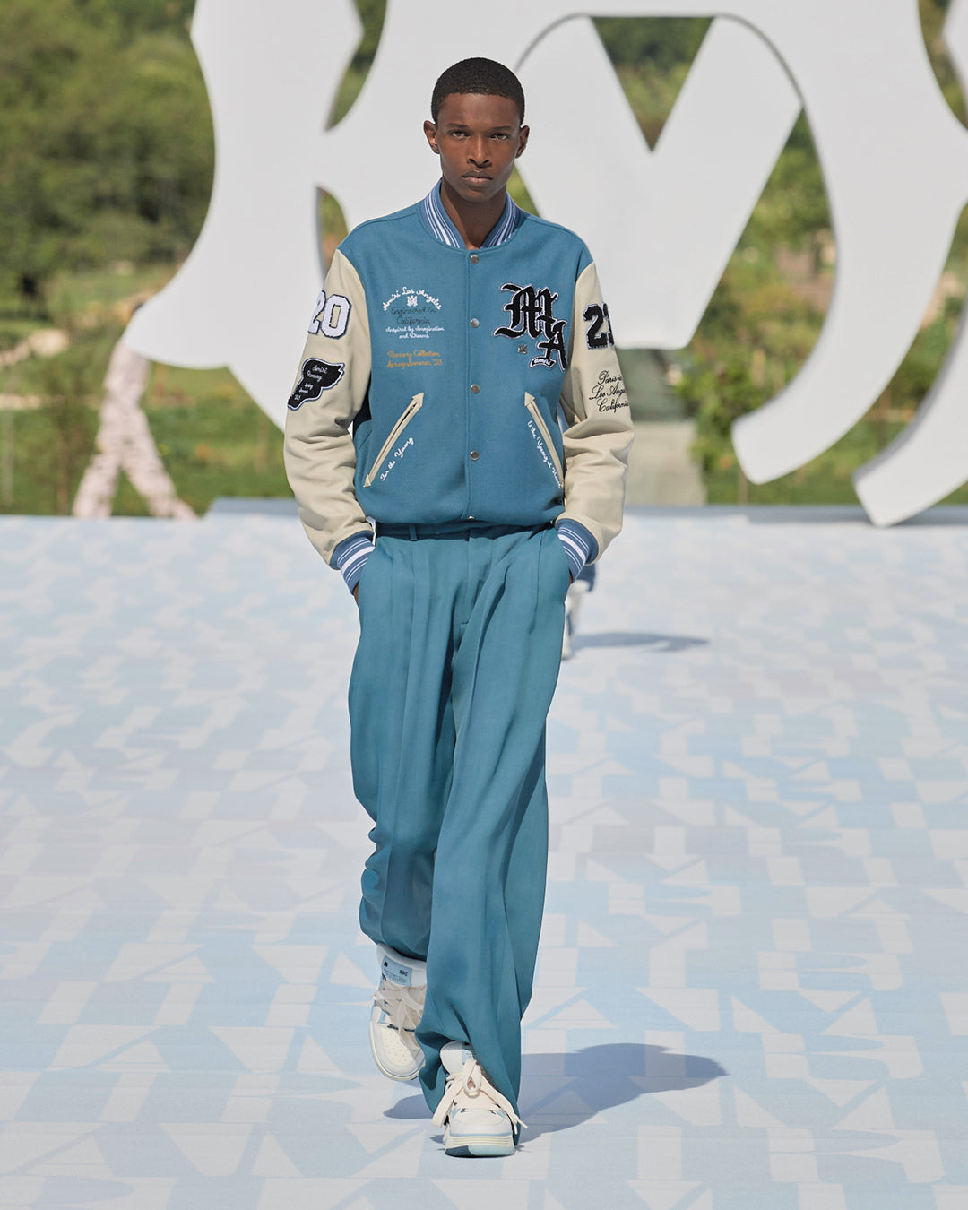 Spring-Summer ‘23 transposes Mike Amiri’s formative Los Angeles years onto a Parisian stage. Here, fleeting memories of skate parks, sports fields and early creativity are transformed into refined tailoring and expressive silhouettes. This is a world where suiting flows like jersey and stagewear meets skate style — blending sophistication with nostalgia in sun-faded hues of alabaster, dusty rose and azure blue.