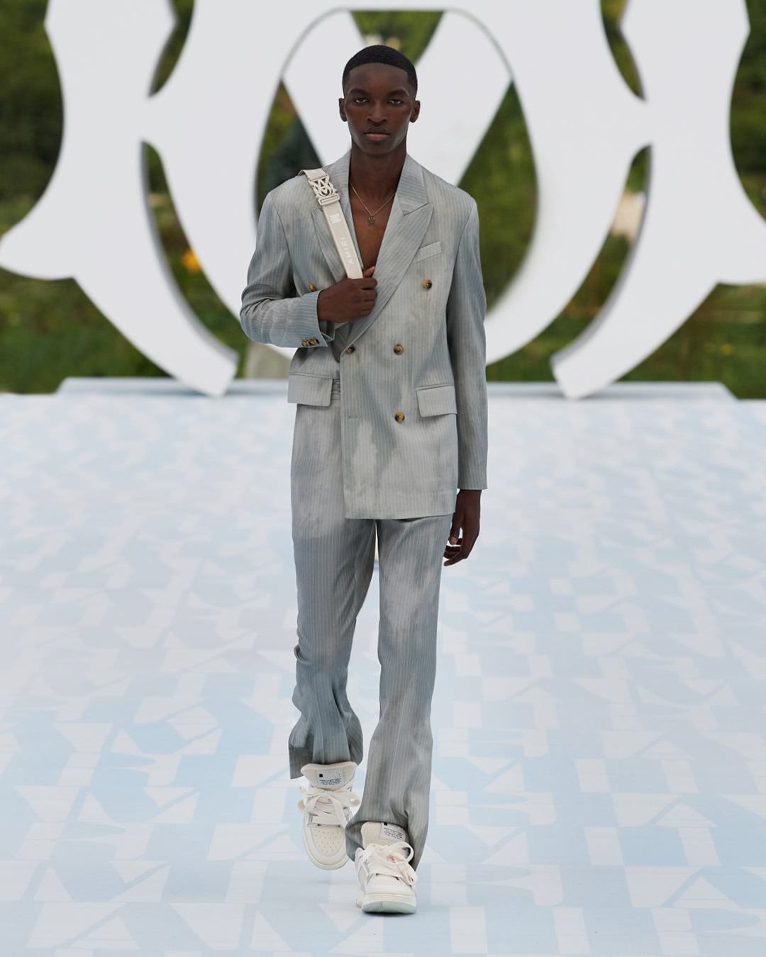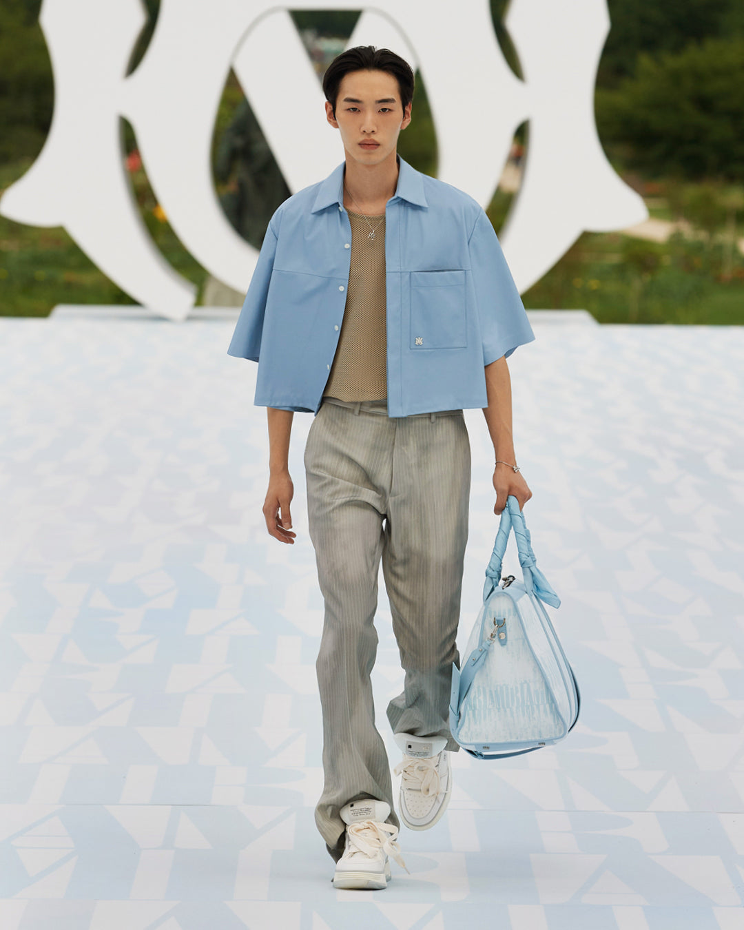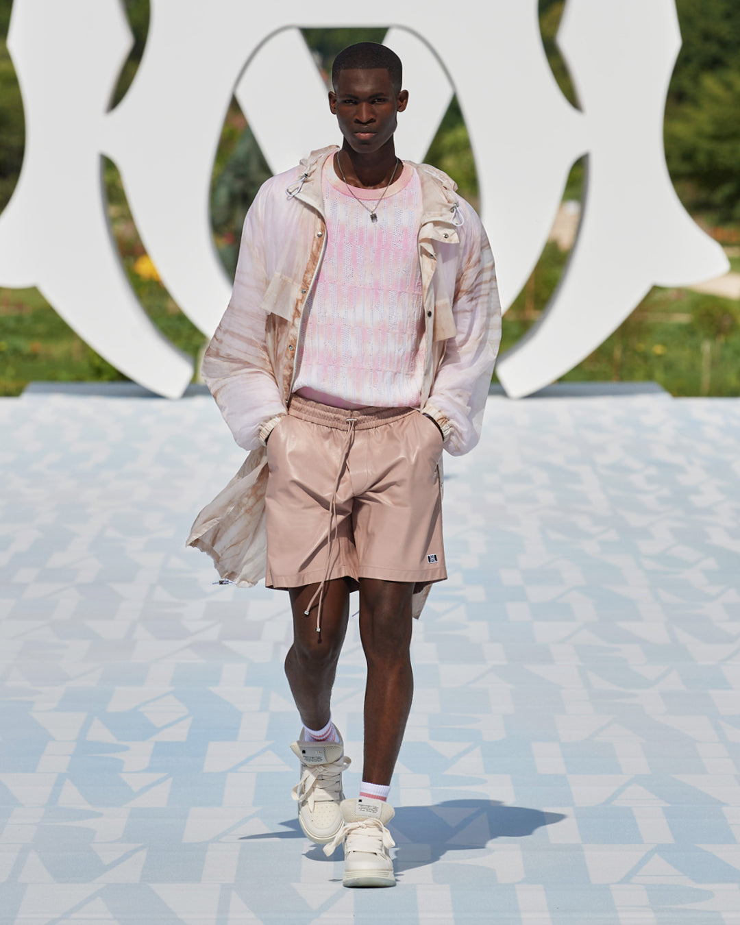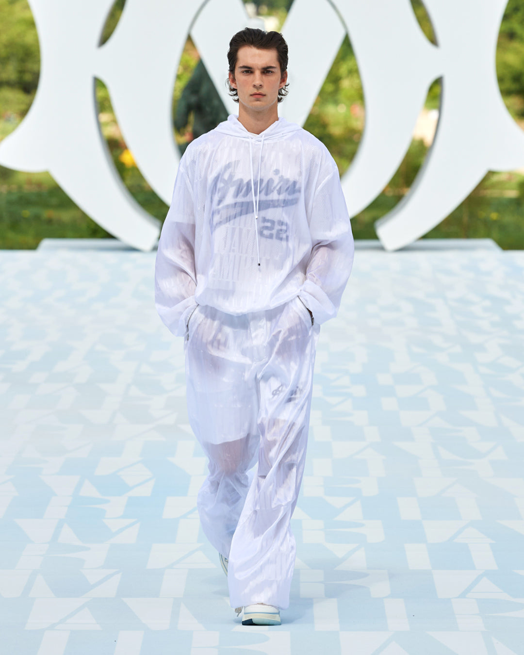 Spring-Summer ‘23 transposes Mike Amiri’s formative Los Angeles years onto a Parisian stage. Here, fleeting memories of skate parks, sports fields and early creativity are transformed into refined tailoring and expressive silhouettes. This is a world where suiting flows like jersey and stagewear meets skate style — blending sophistication with nostalgia in sun-faded hues of alabaster, dusty rose and azure blue.
