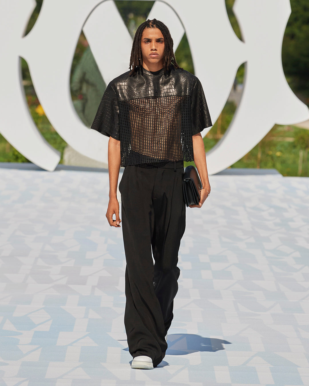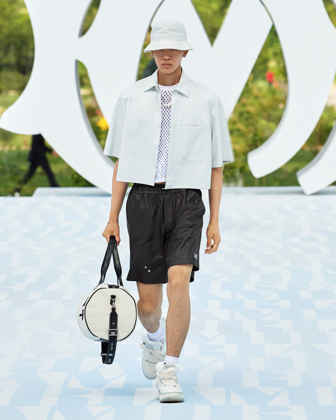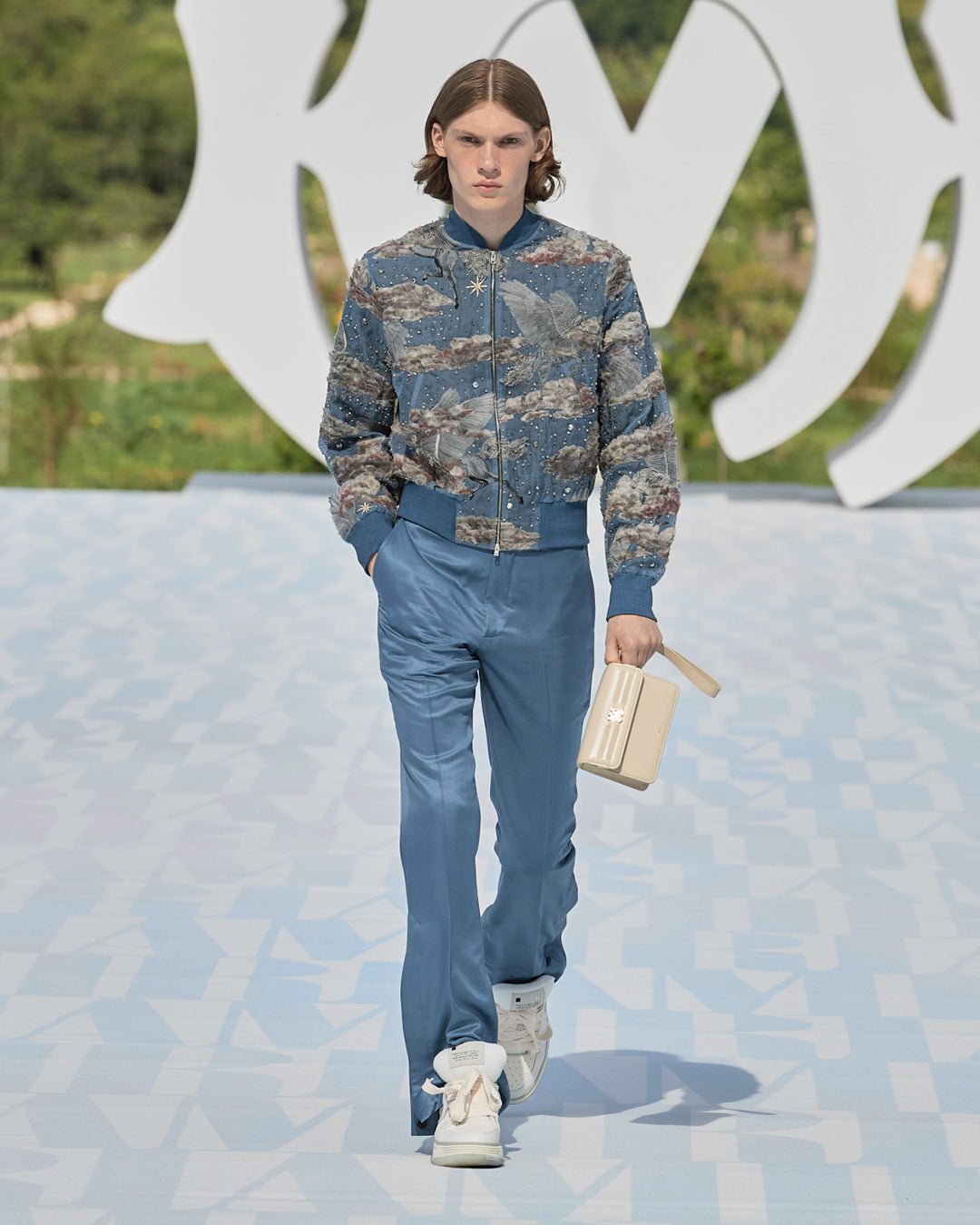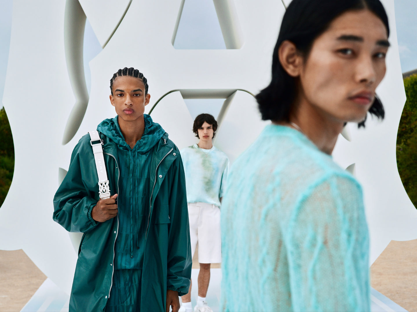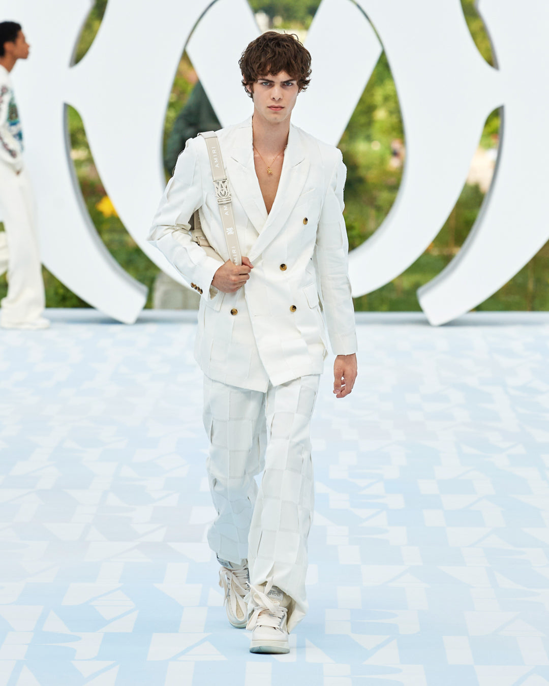 Spring-Summer ‘23 transposes Mike Amiri’s formative Los Angeles years onto a Parisian stage. Here, fleeting memories of skate parks, sports fields and early creativity are transformed into refined tailoring and expressive silhouettes. This is a world where suiting flows like jersey and stagewear meets skate style — blending sophistication with nostalgia in sun-faded hues of alabaster, dusty rose and azure blue.