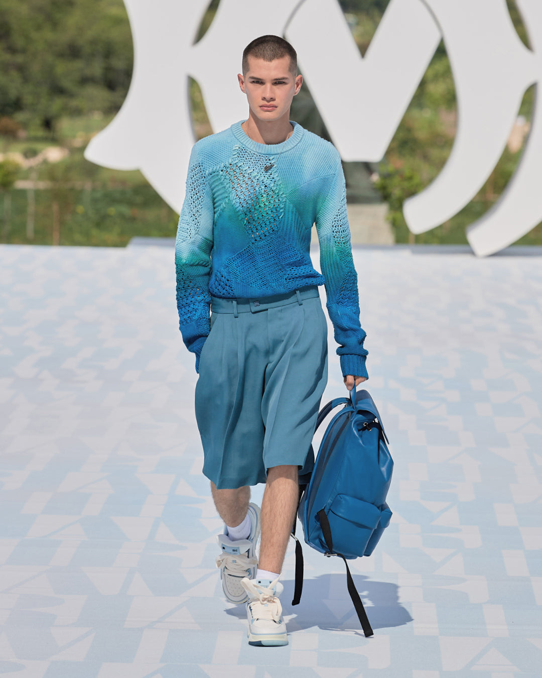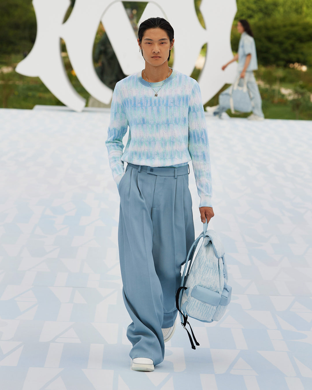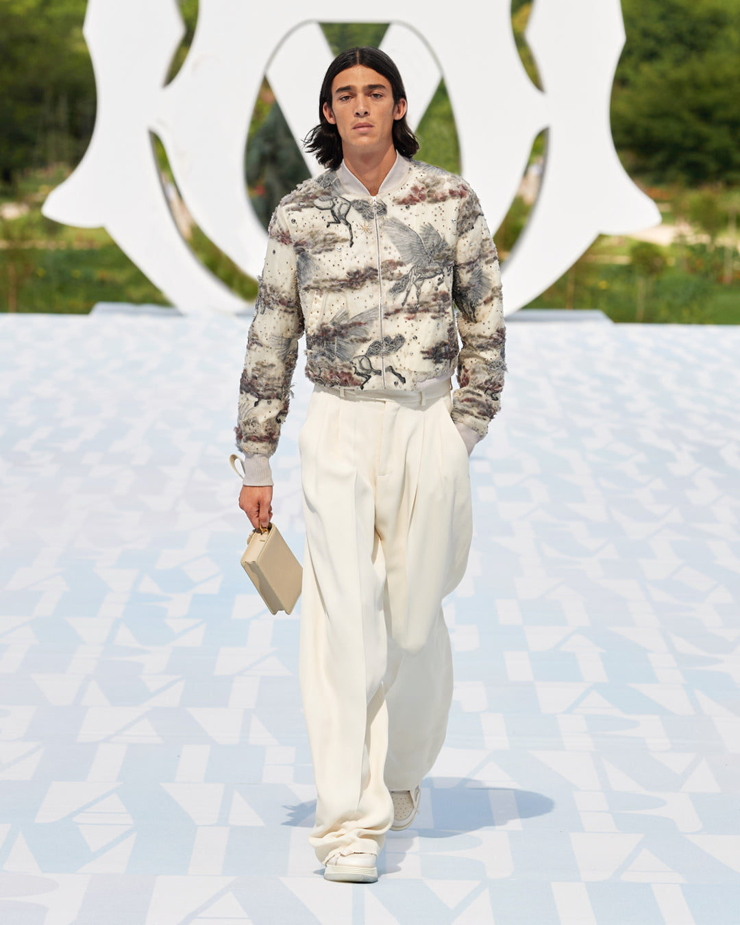 The collection explores the lightness of texture and volume. Traditional materials — leather, silk, suede, cashmere — are softened and reworked through an effortless lens. Wide-leg pleated trousers echo skatewear, while deconstructed blazers and elongated shorts reimagine street codes in a tailored form. From tie-dyed silk tracksuits to patchworked varsity jackets and tapestry knits, garments are imbued with memory, individuality and craft.