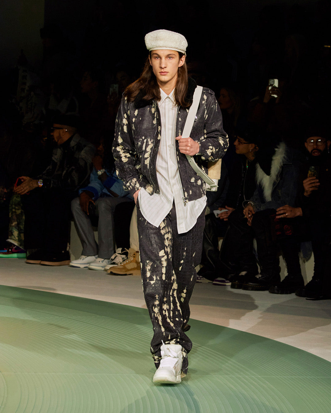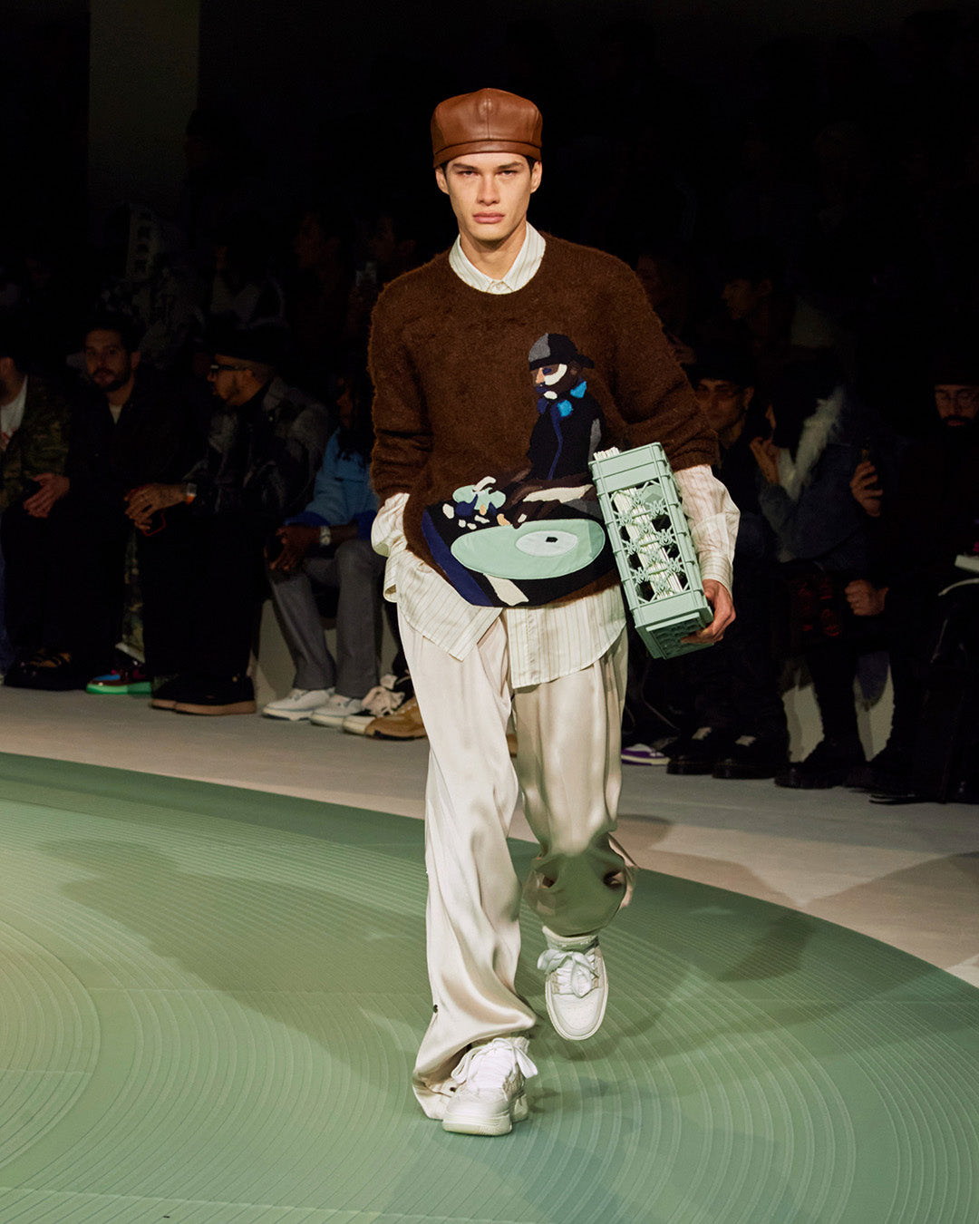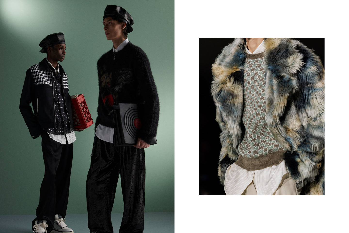 Within a meeting of craft and flow, Premier’s layered musical scores are mirrored by textured garments. An image of Premier at his decks is drawn as knit, while a patchwork varsity jacket is adorned with badges inspired by those from the archive. ‘Some artists make music some make history’ is written in appliqué across select pieces, paying ultimate homage. Like Premier's scratches, Mike Amiri’s ornate, craftful details are his signature.