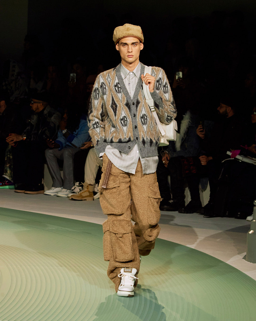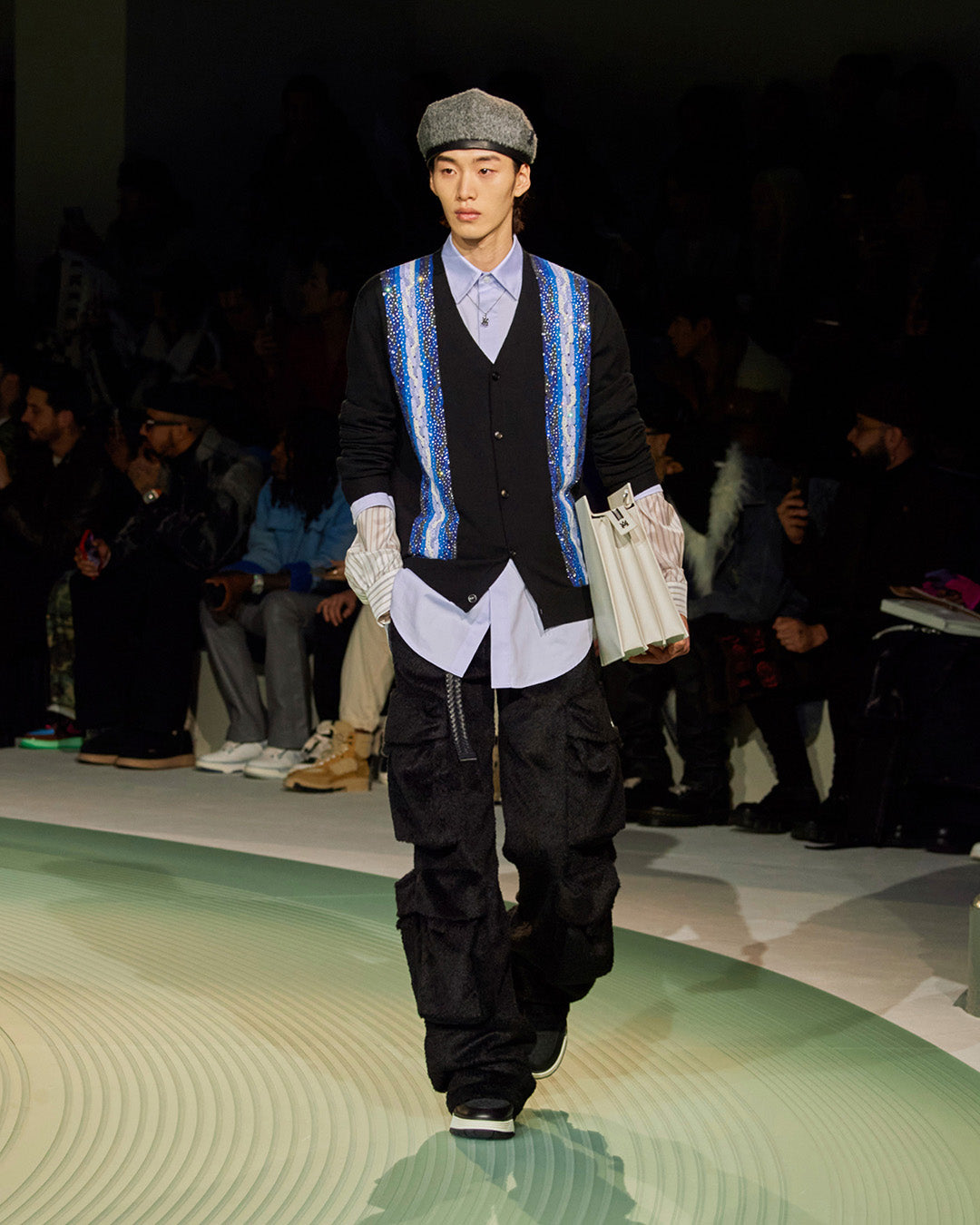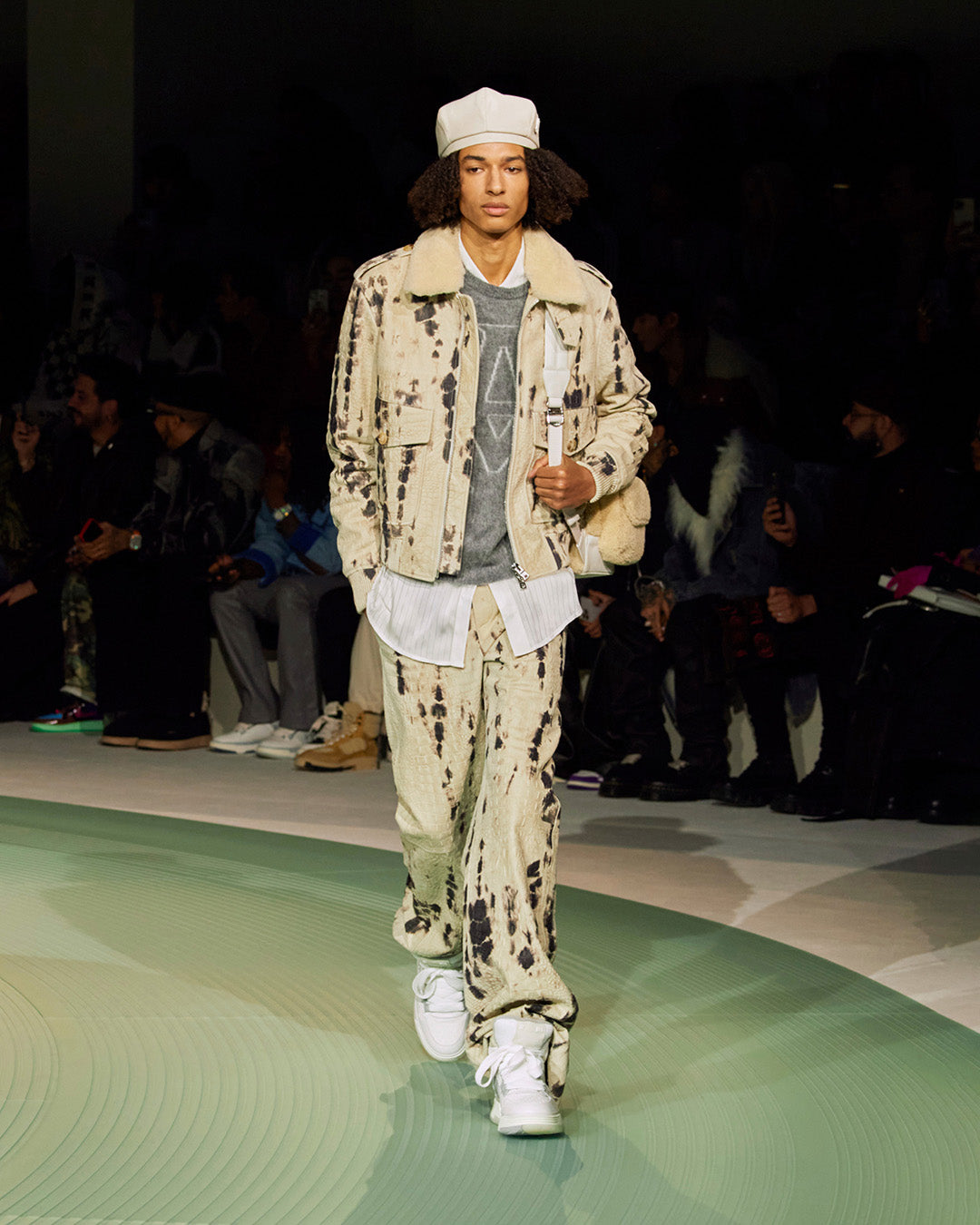 Within a meeting of craft and flow, Premier’s layered musical scores are mirrored by textured garments. An image of Premier at his decks is drawn as knit, while a patchwork varsity jacket is adorned with badges inspired by those from the archive. ‘Some artists make music some make history’ is written in appliqué across select pieces, paying ultimate homage. Like Premier's scratches, Mike Amiri’s ornate, craftful details are his signature.